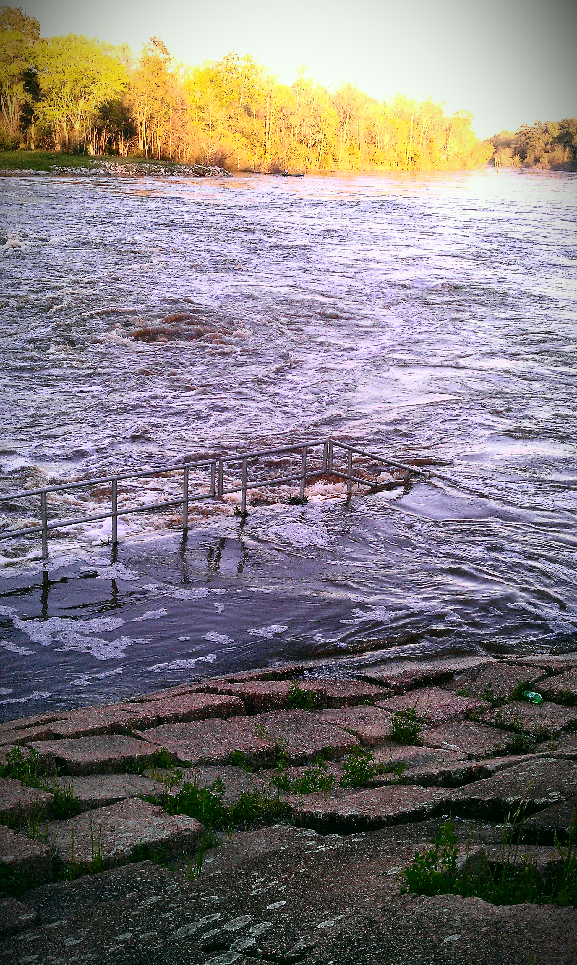 He and I walked down to see the muddy water boiling through the gates from the lake into the flooding river bed.